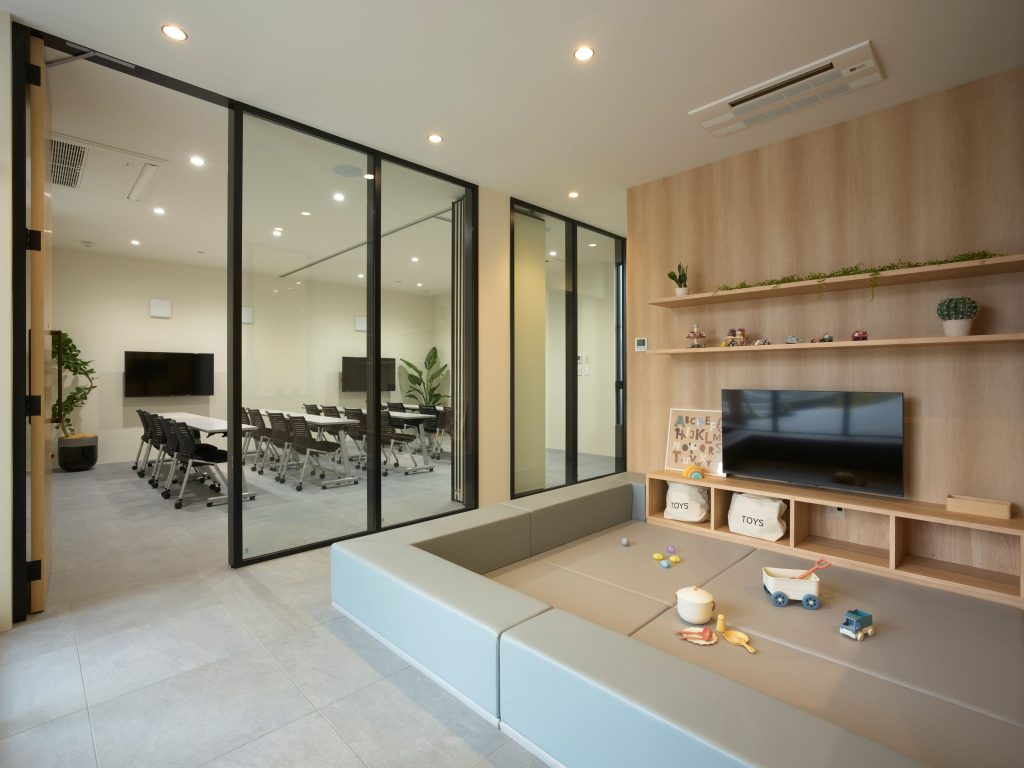 エントランスを入って左手には、大小3つのミーティングルームとキッズコーナーがあり、全室ガラス張りで人の気配を感じながら安心して過ごすことができます。