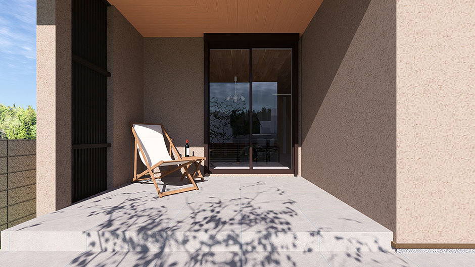 テラスは、周囲の視線を気にせず食事できるよう、奥に引っ込んだ形状です。しっかりと日除けを施し、ご家族だけの安らぎの時間を提供します。