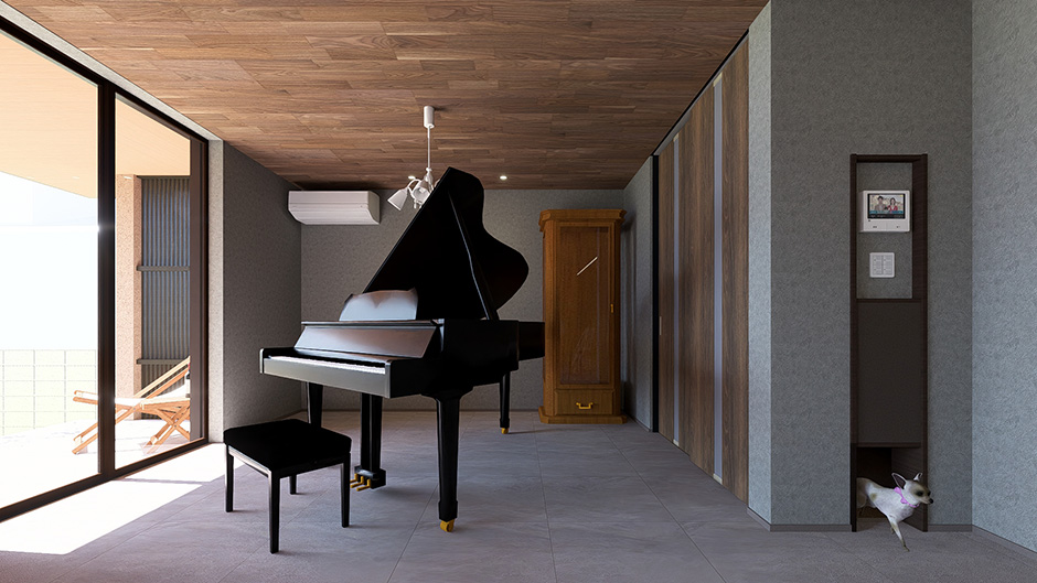 わんちゃん2匹との暮らしのため、床材などには掃除のしやすさ、足腰の負担になりにくい素材を選定。わんちゃんが出入りしやすいよう、テラスへと続く通用口を設けました。