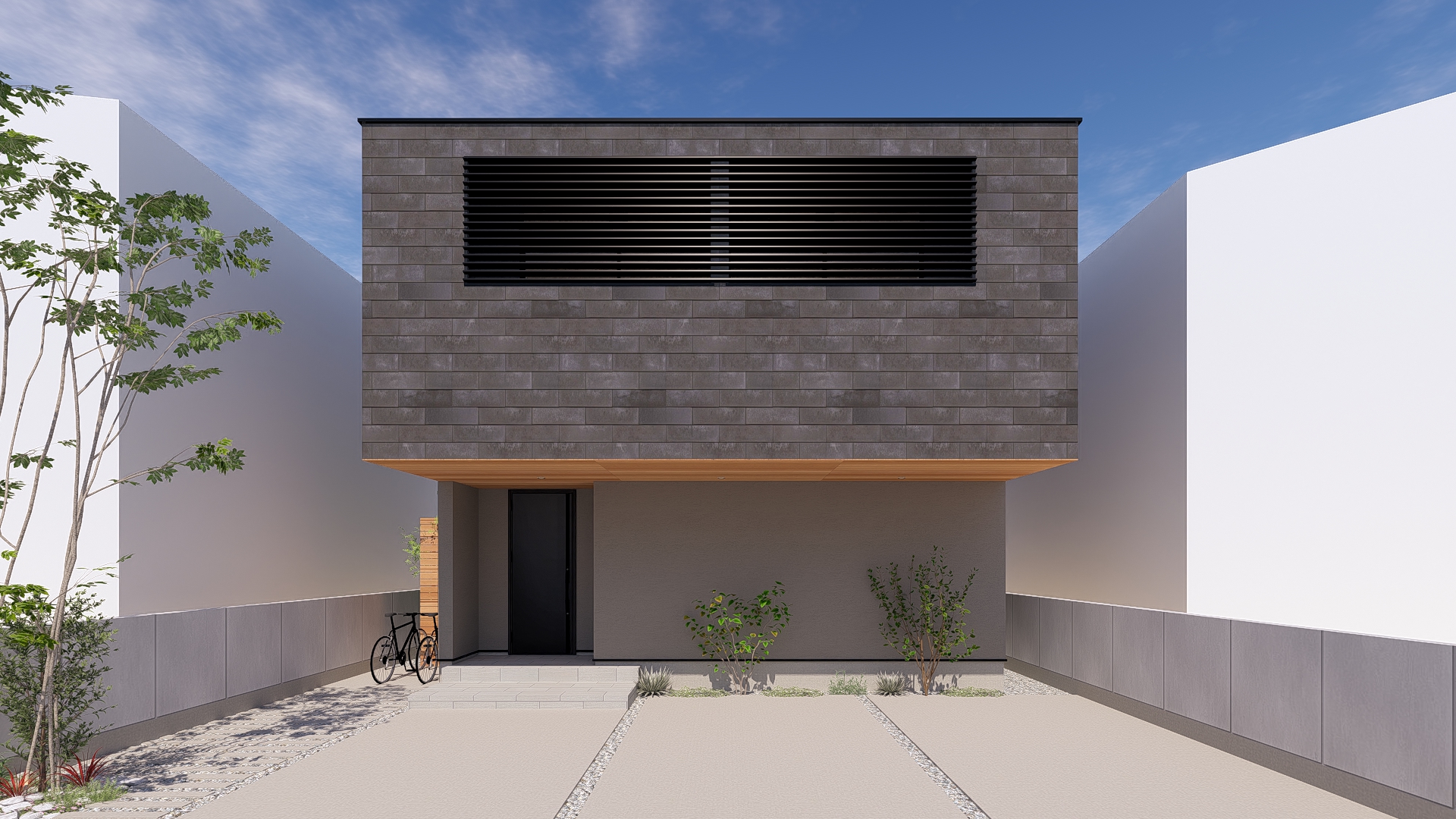 外観は、オーバーハングを活かした印象的なフォルムに、グループ会社濱﨑組の職人による確かな技術、塗り壁仕上げを採用。