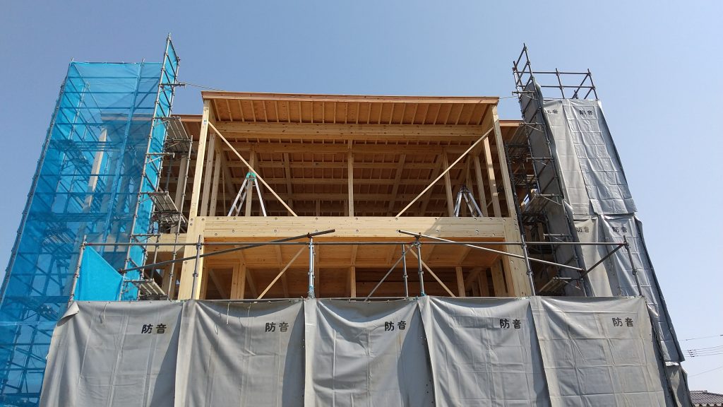 月曜からはじまりました組立工事は、本日で屋根仕舞いまで完了しました(^^)施工面積で約120坪の建物の構造材を、大工さん・監督含め総勢15名でケガ・事故もなく無事㊗上棟できました!本当にありがとうございました<(_ _)>