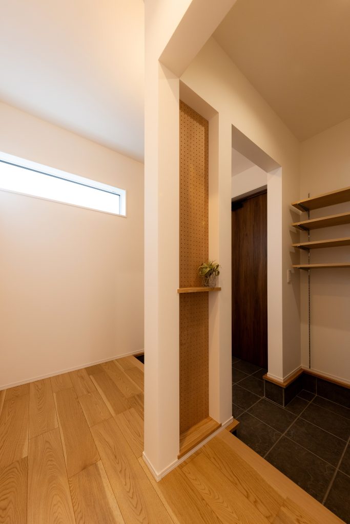 写真は、ニッチと有孔ボードの施工例。ニッチに小物を置いたり、有孔ボードの穴を利用して鍵をかけたりできるようにしています。