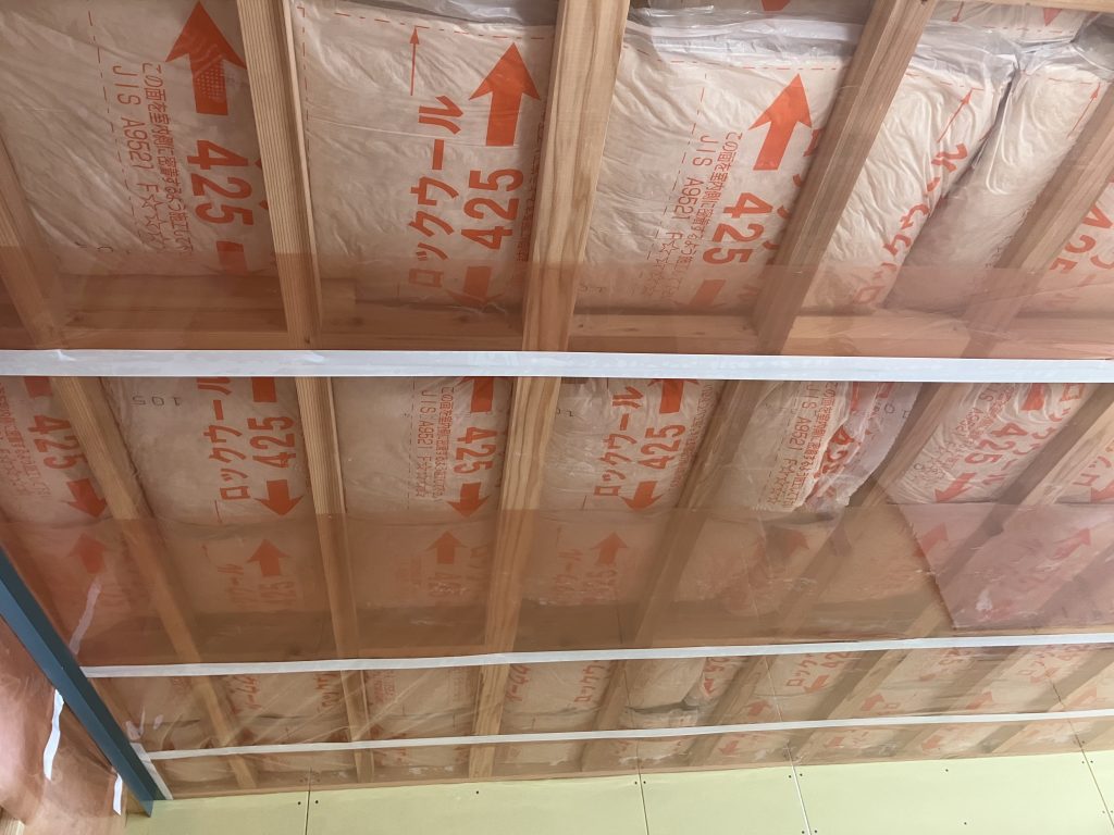 (↑写真は天井、断熱材ロックウールの施工の写真です)
